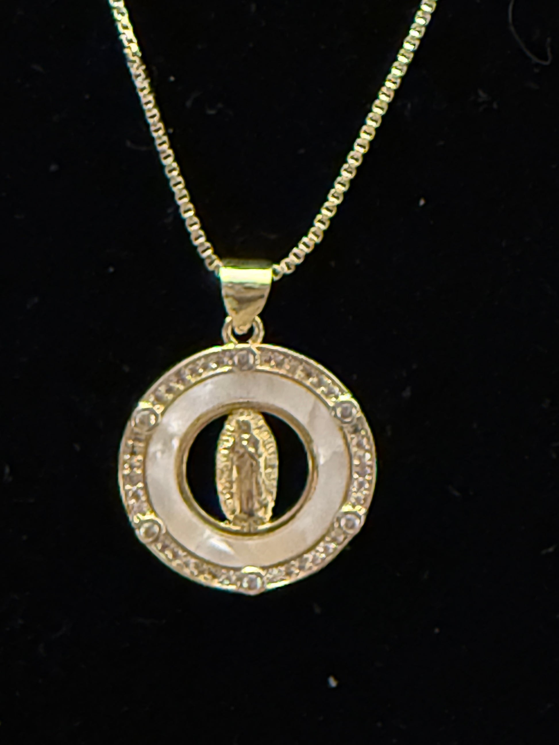 Beautiful simple & elegant Our Lady of Guadalupe necklace accented with Mother of Pearl detail. Available in round or square pendant shape.